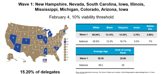 The solution, I believe, is a multi-state wave approach, in which each wave is intentionally similar to the nation as a whole in terms of race, age, and cost of living—and with a focus on regional parity. And I hope it goes without saying that this also means ending undemocratic caucuses in favor of true primaries.